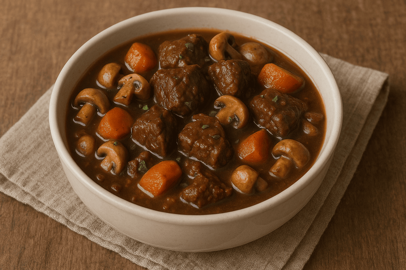 Bœuf mijoté au vin rouge avec légumes et lardons, accompagnement au choix