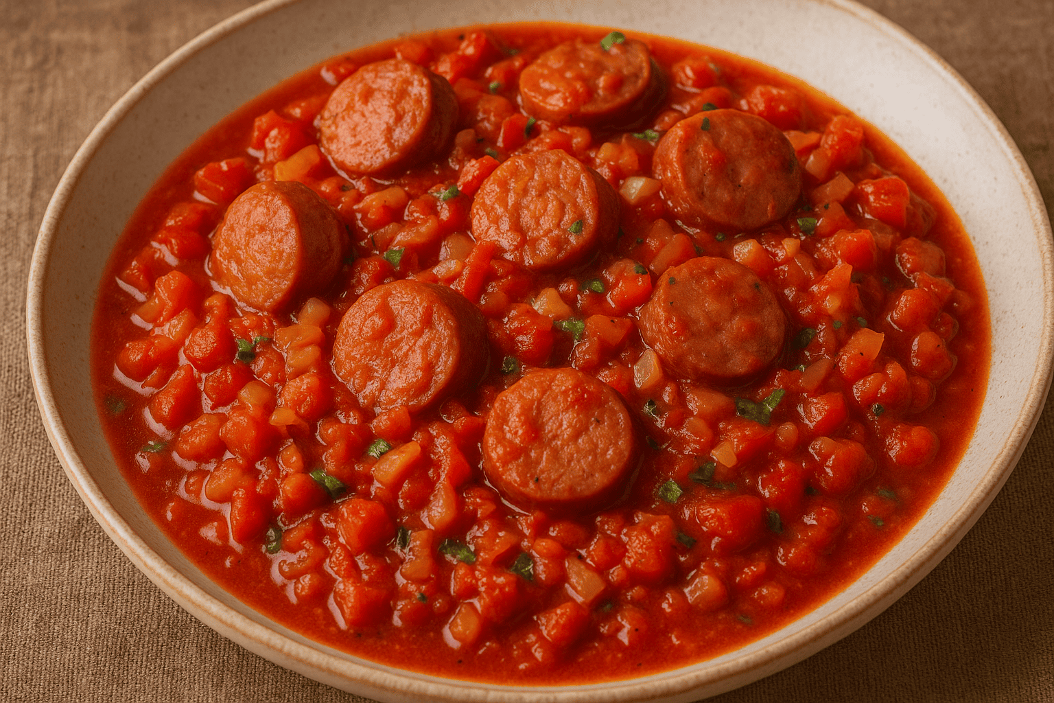Saucisse de Toulouse et saucisse fumée, mijotées dans une sauce tomatée gingembre, curcuma et une pointe de piment Allergènes : lactose